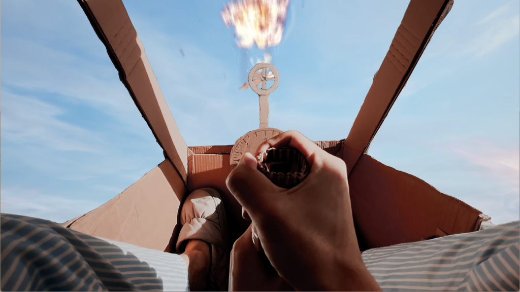 We first scouted the school’s green screen studio. The setup was impressive, but it lacked one crucial element — natural sunlight. We tried to recreate the effect with studio lights, but it just didn’t capture the atmosphere I had in mind. In the end, we bought a piece of green fabric from a materials store and decided to shoot on my apartment balcony instead. This solution not only gave us natural light but also saved us the trouble of moving the giant cardboard airplane back and forth.