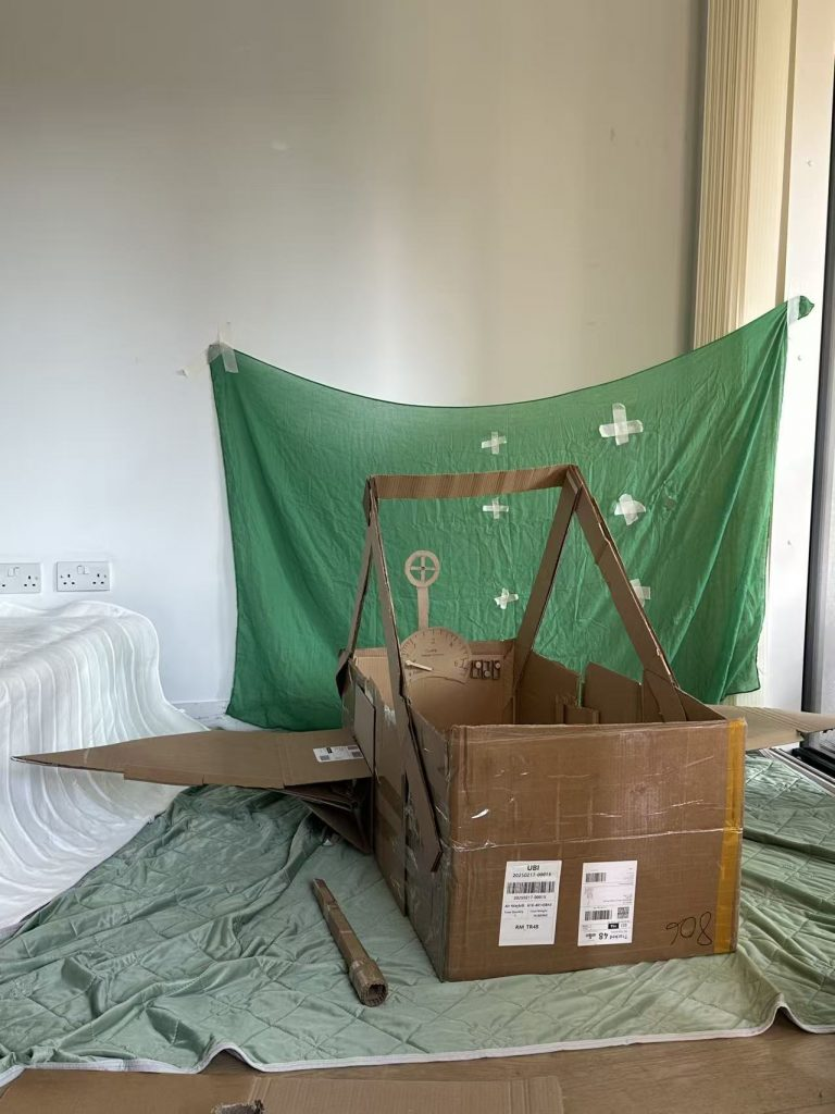 We went to Pondland to pick up some essential tools — scissors, rolls of tape, and a hot glue gun. That evening, we spent almost the entire night cutting, gluing, and assembling the cardboard boxes piled up at home. By the end, we had built a massive cardboard “airplane” — a clumsy but delightful toy that set the stage for the rest of the project. Special thanks to Peiyao, whose background in manufacturing engineering helped us reinforce the structure and make the airplane much sturdier and more reliable